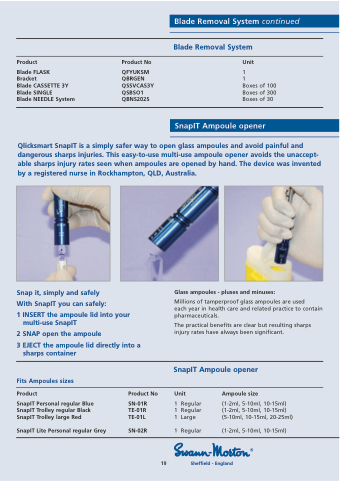 Product Blade FLASK Bracket Blade CASSETTE 3Y Blade SINGLE Blade NEEDLE System Product No QFYUKSM QBRGEN QSSVCAS3Y QSBSO1 QBNS202S Blade Removal System Unit 1 1 Boxes of 100 Boxes of 300 Boxes of 30 Qlicksmart SnapIT is a simply safer way to open glass ampoules and avoid painful and dangerous sharps injuries. This easy-to-use multi-use ampoule opener avoids the unaccept- able sharps injury rates seen when ampoules are opened by hand. The device was invented by a registered nurse in Rockhampton, QLD, Australia. Snap it, simply and safely With SnapIT you can safely: 1 INSERT the ampoule lid into your multi-use SnapIT 2 SNAP open the ampoule 3 EJECT the ampoule lid directly into a sharps container Fits Ampoules sizes Product Product No SnapIT Personal regular Blue SN-01R SnapIT Trolley regular Black TE-01R SnapIT Trolley large Red TE-01L SnapIT Lite Personal regular Grey SN-02R Glass ampoules - pluses and minuses: Millions of tamperproof glass ampoules are used each year in health care and related practice to contain pharmaceuticals. The practical benefits are clear but resulting sharps injury rates have always been significant. SnapIT Ampoule opener Blade Removal System continued SnapIT Ampoule opener Unit 1 Regular 1 Regular 1 Large 1 Regular Ampoule size (1-2ml, 5-10ml, 10-15ml) (1-2ml, 5-10ml, 10-15ml) (5-10ml, 10-15ml, 20-25ml) (1-2ml, 5-10ml, 10-15ml) 19 Sheffield - England