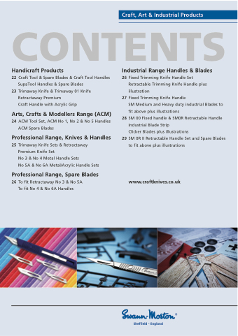 CONTENTS Handicraft Products 22 Craft Tool & Spare Blades & Craft Tool Handles SupaTool Handles & Spare Blades 23 Trimaway Knife & Trimaway 01 Knife Retractaway Premium Craft Handle with Acrylic Grip Arts, Crafts & Modellers Range (ACM) 24 ACM Tool Set, ACM No 1, No 2 & No 5 Handles ACM Spare Blades Professional Range, Knives & Handles 25 Trimaway Knife Sets & Retractaway Premium Knife Set No 3 & No 4 Metal Handle Sets No 5A & No 6A Metal/Acrylic Handle Sets Professional Range, Spare Blades 26 To fit Retractaway No 3 & No 5A To fit No 4 & No 6A Handles Industrial Range Handles & Blades 26 Fixed Trimming Knife Handle Set Retractable Trimming Knife Handle plus illustration 27 Fixed Trimming Knife Handle SM Medium and Heavy duty industrial Blades to fit above plus illustrations 28 SM 00 Fixed handle & SM0R Retractable Handle Industrial Blade Strip Clicker Blades plus illustrations 29 SM 0R II Retractable Handle Set and Spare Blades to fit above plus illustrations www.craftknives.co.uk Sheffield - England Craft, Art & Industrial Products