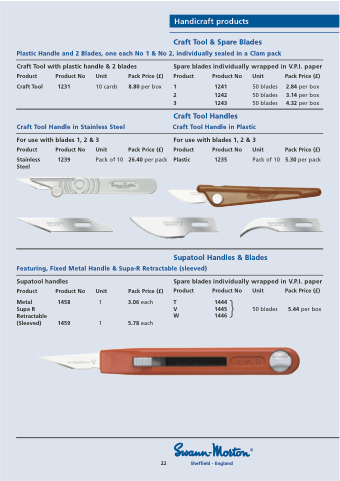 Craft Tool & Spare Blades Plastic Handle and 2 Blades, one each No 1 & No 2, individually sealed in a Clam pack Handicraft products Craft Tool with plastic handle & 2 blades Spare blades individually wrapped in V.P.I. paper Product Craft Tool Product No 1231 Unit 10 cards Pack Price (£) 8.80 per box Pack Price (£) 26.40 per pack Product 1 2 3 Product No 1241 1242 1243 Unit 50 blades 50 blades 50 blades Pack Price (£) 2.84 per box 3.14 per box 4.32 per box Pack Price (£) 5.30 per pack Craft Tool Handle in Stainless Steel For use with blades 1, 2 & 3 Craft Tool Handles Craft Tool Handle in Plastic For use with blades 1, 2 & 3 Product Stainless Steel Product No 1239 Unit Pack of 10 Product Plastic Product No 1235 Unit Pack of 10 Supatool Handles & Blades Featuring, Fixed Metal Handle & Supa-R Retractable (sleeved) Supatool handles Spare blades individually wrapped in V.P.I. paper Product Metal Supa R Retractable (Sleeved) Product No Unit 1458 1 1459 1 Pack Price (£) Product 3.06 each T V Product No 1444 } 1445 1446 Unit 50 blades Pack Price (£) 5.44 per box 5.78 each W 22 Sheffield - England