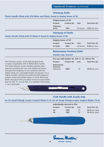 Trimaway Knife Plastic Handle fitted with 25A Blade and Plastic Guard in display boxes of 50 Display boxes of 50 Product Trimaway Knife Product No 1801 Unit 50 knives Unit 50 knives Pack Price (£) 12.47 per box Pack Price (£) 15.90 per box Display boxes of 50 Trimaway 01 Knife Plastic Handle fitted with 01 Blade & Guard in display boxes of 50 Product 01 Knife Product No 9401 Retractaway Premium Knife Handle only, sleeved The Premium version of the Retractaway Knife is easily recognisable with its Reflex Blue handle. The knife features a more durable stainless steel bayonet providing the user with additional lateral strength and longevity of use combined with the added safety of a retractable blade mechanism. It is a highly versatile cutting tool produced with designers, graphic artists and model makers in mind. With easy blade changing it fits and safely retracts surgical blade Nos.10, 10A, 11, 15 and 15A. It is available individually or as a retail pack. Product Retractaway Premium (Sleeved) Product No Unit 2806 10 Pack Price (£) 29.60 per box For use with blades 10, 10A 11, 15, 15A & 15C Craft Handle with Acrylic Grip No 5A (small fitting) accepts Surgical Blades 6-16, No 6A (large fitting) accepts Surgical Blades 18-36 Individually sleeved in film Product 5A 6A Product No Unit 1005 10 1006 10 Pack Price (£) 39.10 per pack 39.10 per pack 23 Sheffield - England Handicraft Products continued