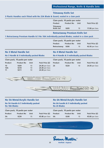 Trimaway Knife Set 3 Plastic Handles each fitted with No 25A Blade & Guard, sealed in a clam pack Clam pack, 10 packs per outer Product Product No Unit Trimaway Knife Set 9205 10 Pack Price (£) 17.00 per box Retractaway Premium Knife Set 1 Retractaway Premium Handle & 5 No 10A individually packed Blades, sealed in a clam pack No 3 Metal Handle Set No 3 Handle & 5 individually packed Blades Clam pack, 10 packs per outer Product Product No Unit Pack Price (£) 10 42.30 per box Retractaway 9206 No 4 Metal Handle Set No 4 Handle & 5 individually packed Blades Clam pack, 10 packs per outer Clam pack, 10 packs per outer Product 10 10A 11 Product No 9209 9210 9211 Unit 10 10 10 Pack Price (£) 24.30 per box 24.30 per box 24.30 per box Product 26 Product No Unit 9220 10 Pack Price (£) 24.30 per box No 5A Metal/Acrylic Handle Set No 6A Metal/Acrylic Handle Set Clam pack, 10 packs per outer No 5A Handle & 5 individually packed No 10A Blades Clam pack, 10 packs per outer No 6A handle & 5 individually packed No 26 Blades Product 5A Product No Unit 9230 10 Pack Price (£) Product 45.80 per box 6A Product No Unit 9240 10 Pack Price (£) 45.80 per box 25 Sheffield - England Professional Range, Knife & Handle Sets
