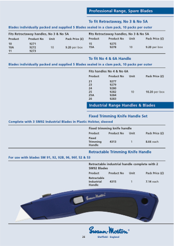 Professional Range, Spare Blades To fit Retractaway, No 3 & No 5A Blades individually packed and supplied 5 Blades sealed in a clam pack, 10 packs per outer Fits Retractaway handles, No 3 & No 5A 7Fits Retractaway handles, No 3 & No 5A Product 10 10A 11 Product No 9271 9272 9273 Unit 10 Pack Price (£) 9.20 per box Product 15 15A Product No 9275 9278 Unit 10 Pack Price (£) 9.20 per box Fits handles No 4 & No 6A Product Product No Unit 21 9277 23 9279 24 9280 25 9282 10 25A 9284 26 9283 Pack Price (£) 10.20 per box To fit No 4 & 6A Handle Blades individually packed and supplied 5 Blades sealed in a clam pack, 10 packs per outer Industrial Range Handles & Blades Fixed Trimming Knife Handle Set Complete with 3 SM92 Industrial Blades in Plastic Holster, sleeved Fixed trimming knife handle Product Product No Unit Fixed Trimming 4313 1 Handle Pack Price (£) 8.66 each Retractable Trimming Knife Handle For use with blades SM 91, 92, 92B, 96, 96F, 52 & 53 Retractable industrial handle complete with 2 SM92 Blades Product Retractable Industrial Handle Product No Unit 4315 1 Pack Price (£) 7.14 each 26 Sheffield - England