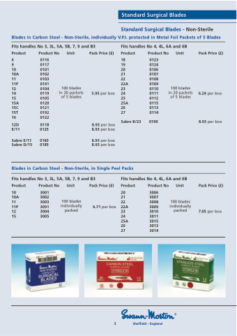 Standard Surgical Blades - Non-Sterile Blades in Carbon Steel - Non-Sterile, individually V.P.I. protected in Metal Foil Packets of 5 Blades Fits handles No 3, 3L, 5A, 5B, 7, 9 and B3 Fits handles No 4, 4L, 6A and 6B Product Product No Unit Pack Price (£) 5.95 per box 8.93 per box 8.93 per box 8.93 per box 8.93 per box Product Product No Unit Pack Price (£) 6.24 per box 8.93 per box 6 0116 9 0117 10 0101 10A 0102 11 0103 11P 0191 12 0104 14 0119 15 0105 15A 0120 15C 0121 15T 0192 16 0122 12D 0118 E/11 0125 Sabre E/11 0183 Sabre D/15 0185 18 0123 19 0124 20 0106 21 0107 22 0108 22A 0109 23 0110 24 0111 25 0112 25A 0115 26 0113 27 0114 Sabre B/23 0190 100 blades in 20 packets of 5 blades 100 blades in 20 packets of 5 blades Blades in Carbon Steel - Non-Sterile, in Single Peel Packs Fits handles No 3, 3L, 5A, 5B, 7, 9 and B3 Fits handles No 4, 4L, 6A and 6B Product Product No Unit Pack Price (£) Product 10 3001 20 10A 3002 21 11 3003 100 blades 22 11P 3091 individually 6.71 per box 22A 12 3004 packed 23 15 3005 24 25A 26 27 Product No 3006 3007 3008 3009 3010 3011 3015 3013 3014 Unit 100 blades individually packed Pack Price (£) 7.05 per box 3 Sheffield - England Standard Surgical Blades