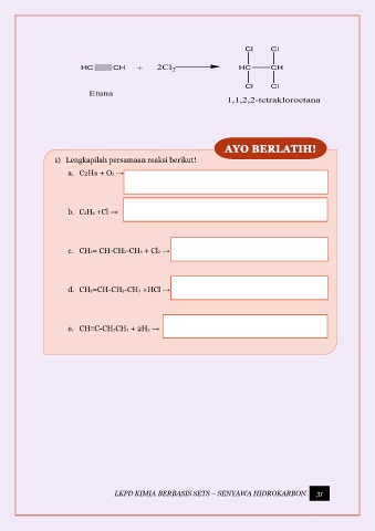 1) Lengkapilah persamaan reaksi berikut! a. C₂H₈ + O₂ → b. C₂H₆ +Cl → c. CH₂= CH-CH₂-CH₃ + Cl₂ → d. CH₂=CH-CH₂-CH₃ +HCl → e. CH≡C-CH₂CH₃ + 2H₂ → LKPD KIMIA BERBASIS SETS – SENYAWA HIDROKARBON 31