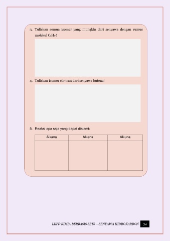3. Tuliskan semua isomer yang mungkin dari senyawa dengan rumus molekul C₆H₁₄! 4. Tuliskan isomer cis-tran dari senyawa butena! 5. Reaksi apa saja yang dapat dialami: Alkana Alkena Alkuna LKPD KIMIA BERBASIS SETS – SENYAWA HIDROKARBON 34