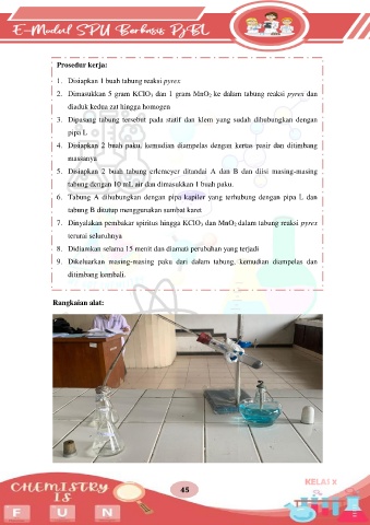 7. Dinyalakan pembakar spiritus hingga KClO 3 dan MnO 2 dalam tabung reaksi pyrex