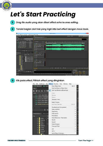 Let's Start Practicing 1 Drag file audio yang akan diberi effect echo ke area editing. 2 Tandai bagian dari trek yang ingin kita beri effect dengan move tools. 3 Klik pada effect, Pilihlah effect yang diinginkan TEKNIK MULTIMEDIA Turn The Page >>