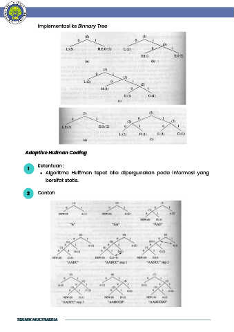implementasi ke Binnary Tree Adaptive Hufman Coding Ketentuan : 1 Algoritma Huffman tepat bila dipergunakan pada informasi yang bersifat statis. 2 Contoh TEKNIK MULTIMEDIA