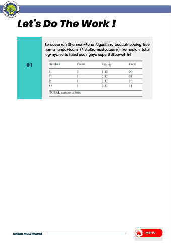 Let's Do The Work ! Berdasarkan Shannon–Fano Algorithm, buatlah coding tree nama anda+teum (RistaBramastyateum), kemudian total log-nya serta tabel codingnya seperti dibawah ini 0 1 TEKNIK MULTIMEDIA MENU