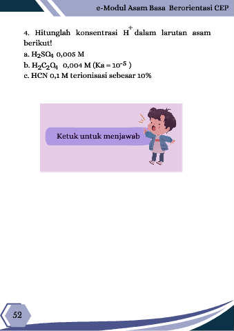 e-Modul Asam Basa Berorientasi CEP + 4. Hitunglah konsentrasi H dalam larutan asam berikut! a. H SO 0,005 M 4 2 -5 b. H C O 0,004 M (Ka = 10 ) 2 2 4 c. HCN 0,1 M terionisasi sebesar 10% Ketuk untuk menjawab 52