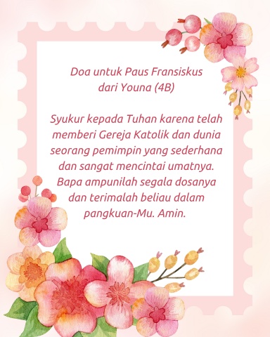 Doa untuk Paus Fransiskus dari Youna (4B) Syukur kepada Tuhan karena telah memberi Gereja Katolik dan dunia seorang pemimpin yang sederhana dan sangat mencintai umatnya. Bapa ampunilah segala dosanya dan terimalah beliau dalam pangkuan-Mu. Amin.