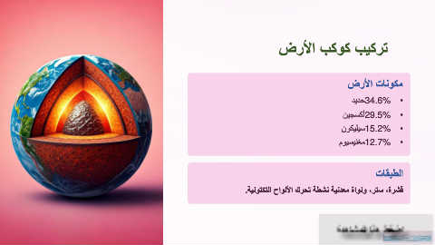 تركٌب كوكب الأرض مكونات الأرض 34.6%حدٌد • 29.5%أكسجٌن • 15.2%سٌلٌكون • 12.7%مغنٌسٌوم • الطبمات لشرة ،ستر ،ونواة معدنٌة نشطة تحرن الألواح التكتونٌة.