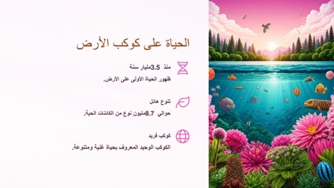 الحٌاة على كوكب الأرض منذ 3.5ملٌار سنة ظهور الحٌاة الأولى على الأرض. تنوع هائل حوالً 8.7ملٌون نوع من الكائنات الحٌة. كوكب فرٌد الكوكب الوحٌد المعروف بحٌاة غنٌة ومتنوعة.