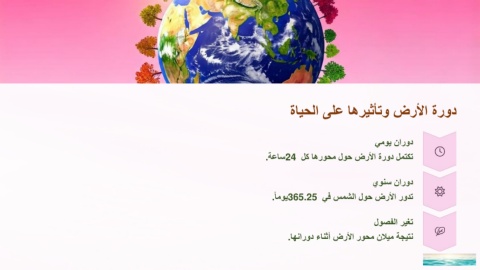 دورة الأرض وتأثٌرها على الحٌاة دوران ٌومً تكتمل دورة الأرض حول محورها كل 24ساعة. دوران سنوي تدور الأرض حول الشمس فً ٌ365.25وما. تغٌر الفصول نتٌجة مٌلان محور الأرض أثناء دورانها.