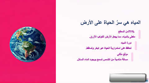 المٌاه هً سر الحٌاة على الأرض 71%من السطح مغطى بالمٌاه ،مما ٌجعل الأرض الكوكب الأزرق. دورة المٌاه تحافظ على استمرارٌة الحٌاة عبر تبخر وتسالط. مولع مثالً مسافة مناسبة من الشمس تسمح بوجود الماء السائل.