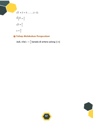 √ × 2 = 3 … … … (÷ 2) √ ×2 = 3 2 2 3 √ = 2 9 = 4 Tahap Melakukan Pengecekan 9 Jadi, nilai = berada di antara selang [1,4] 4 67