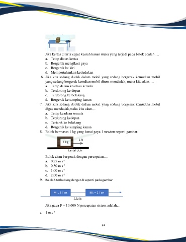 Jika kertas ditarik cepat kearah kanan maka yang terjadi pada balok adalah….
