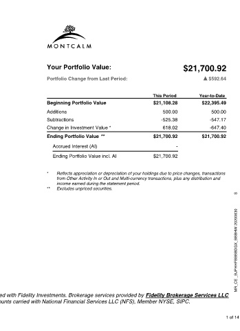 MR_CE _BJPHHFBBBBDGX_BBBHW 20200630 SAN FRANCISCO CA 94118-2603 101 COMMONWEALTH AVE ** income earned during the statement period. Your Client * Ending Portfolio Value incl. AI Accrued Interest (AI) Ending Portfolio Value Change in Investment Value * Subtractions Additions Beginning Portfolio Value SAN FRANCISCO CA 94103 This Period 2ND FLOOR 1083 MISSION STREET MONTCALM TCR LLC Portfolio Change from Last Period: $21,700.92 ID: G14283099 June 1, 2020 - June 30, 2020 INVESTMENT REPORT