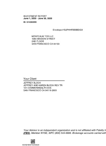 MR_CE _BJPHHFBBBBDGX_BBBMW 20200630 SAN FRANCISCO CA 94118-2603 101 COMMONWEALTH AVE JEFFREY AND KAREN BLOCK REV TR ** income earned during the statement period. Your Client * Ending Portfolio Value incl. AI Accrued Interest (AI) Ending Portfolio Value Change in Investment Value * Subtractions Additions Beginning Portfolio Value SAN FRANCISCO CA 94103 This Period 2ND FLOOR 1083 MISSION STREET MONTCALM TCR LLC Portfolio Change from Last Period: $12,172,376.93 ID: G14283099 June 1, 2020 - June 30, 2020 INVESTMENT REPORT