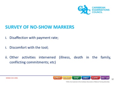 SURVEY OF NO-SHOW MARKERS i. Disaffection with payment rate; i. Discomfort with the tool; ii. Other activities intervened (illness, death in the family, conflicting commitments; etc) 12