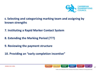 6. Selecting and categorizing marking team and assigning by known strengths 7. Instituting a Rapid Marker Contact System 8. Extending the Marking Period (???) 9. Reviewing the payment structure 10. Providing an “early completion incentive” 17