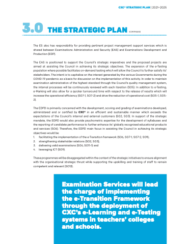 The EAS is positioned to support the Council’s strategic imperatives and the proposed projects are aimed at assisting the Council in achieving its strategic objectives. The expansion of the e-Testing population where possible facilitates on-demand testing which will allow the Council to further satisfy its’ stakeholders. The intent is to capitalise on the interest generated by the various Governments during the COVID-19 pandemic as a basis for discussion on the implementation of this activity. In order to maintain examination administration of the highest standard through the Council’s quality management system, the internal processes will be continuously reviewed with each iteration (SO5). In addition to e-Testing, e-Marking will also allow for a quicker turnaround time with respect to the release of results which will increase the operational efficiency (SO7-1, SO7-2) and drive the reduction of operational cost (SO5-1, SO5- 2).
