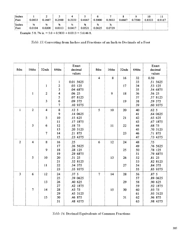 Table 13. Converting from Inches and Fractions of an Inch to Decimals of a Foot Table 14. Decimal Equivalents of Common Fractions 385