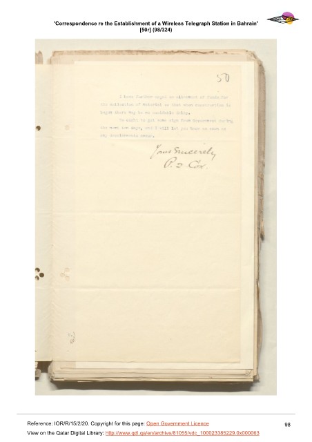 'Correspondence re the Establishment of a Wireless Telegraph Station in Bahrain'