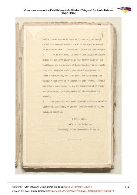 'Correspondence re the Establishment of a Wireless Telegraph Station in Bahrain'
