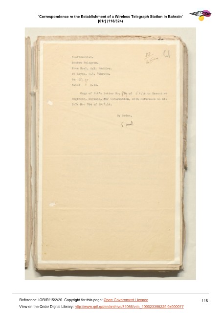'Correspondence re the Establishment of a Wireless Telegraph Station in Bahrain'