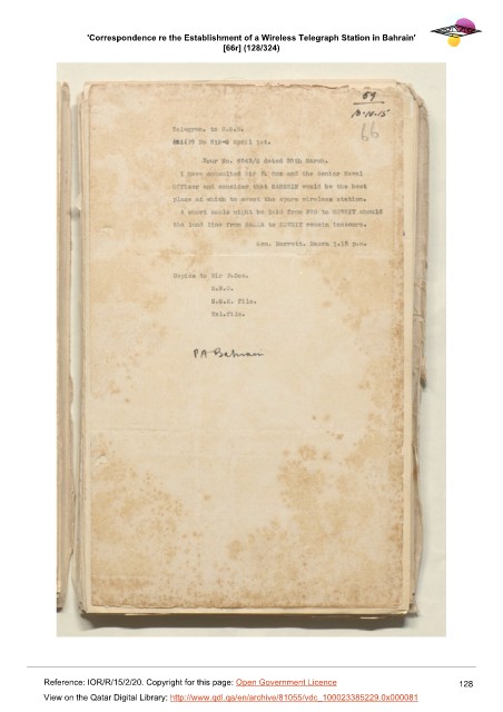 'Correspondence re the Establishment of a Wireless Telegraph Station in Bahrain'