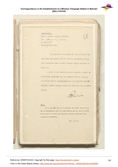 'Correspondence re the Establishment of a Wireless Telegraph Station in Bahrain'