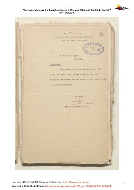 'Correspondence re the Establishment of a Wireless Telegraph Station in Bahrain'