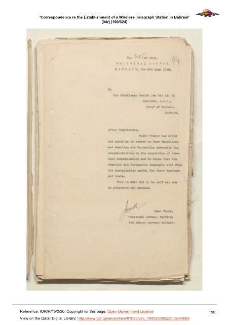 'Correspondence re the Establishment of a Wireless Telegraph Station in Bahrain'