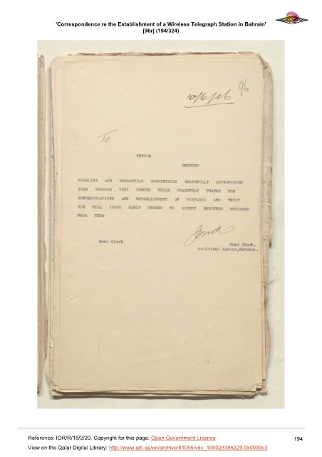 'Correspondence re the Establishment of a Wireless Telegraph Station in Bahrain'