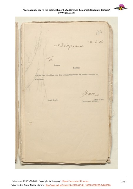 'Correspondence re the Establishment of a Wireless Telegraph Station in Bahrain'