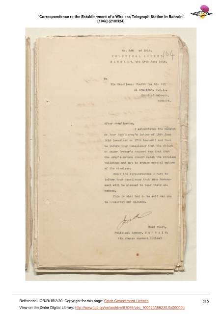 'Correspondence re the Establishment of a Wireless Telegraph Station in Bahrain'