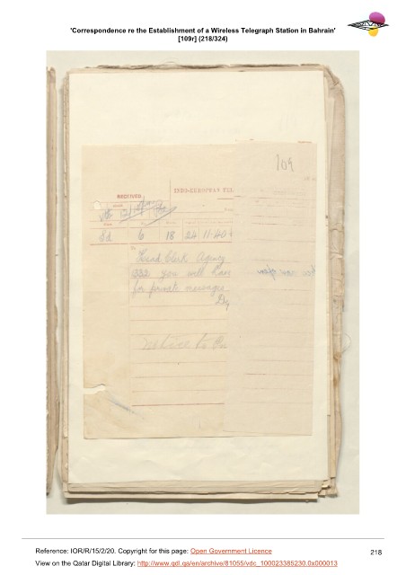 'Correspondence re the Establishment of a Wireless Telegraph Station in Bahrain'