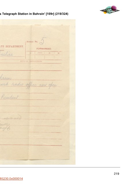 'Correspondence re the Establishment of a Wireless Telegraph Station in Bahrain' [109r] (219/324)