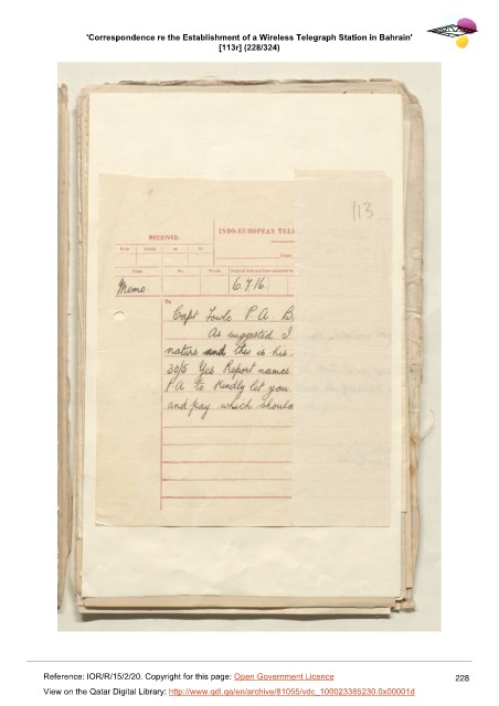 'Correspondence re the Establishment of a Wireless Telegraph Station in Bahrain'