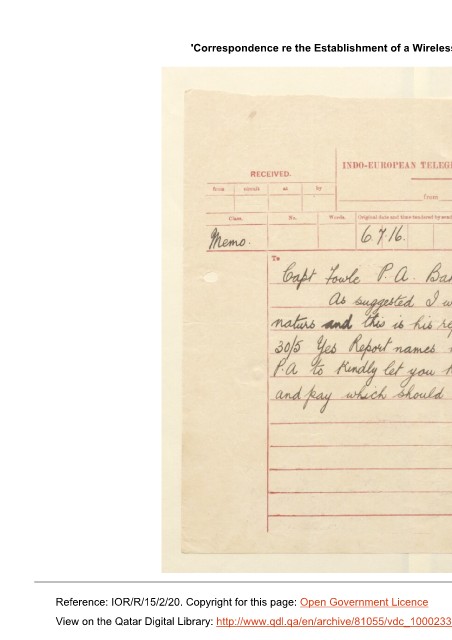 'Correspondence re the Establishment of a Wireless Telegraph Station in Bahrain' [113r] (229/324)