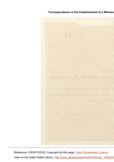 'Correspondence re the Establishment of a Wireless Telegraph Station in Bahrain' [113v] (230/324)
