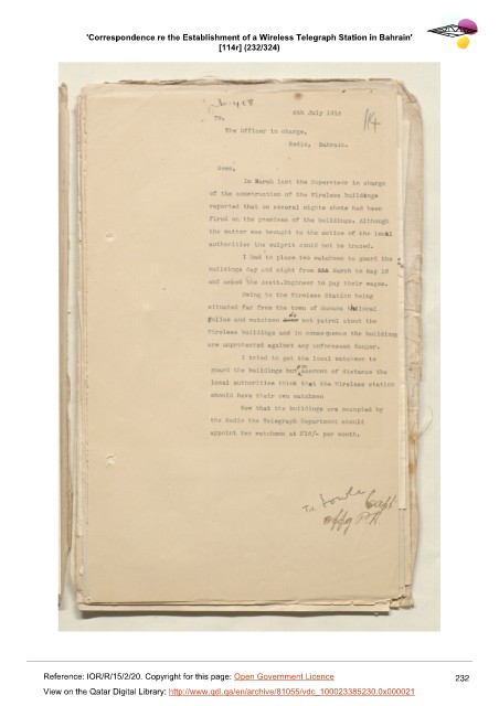'Correspondence re the Establishment of a Wireless Telegraph Station in Bahrain'