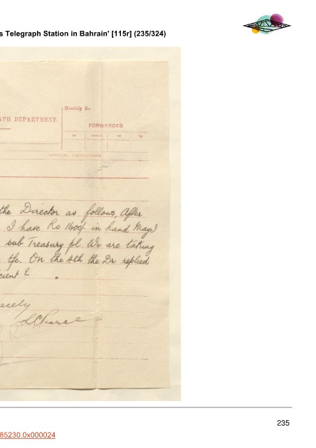 'Correspondence re the Establishment of a Wireless Telegraph Station in Bahrain' [115r] (235/324)