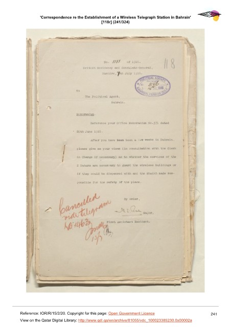 'Correspondence re the Establishment of a Wireless Telegraph Station in Bahrain'