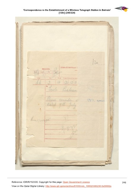 'Correspondence re the Establishment of a Wireless Telegraph Station in Bahrain'