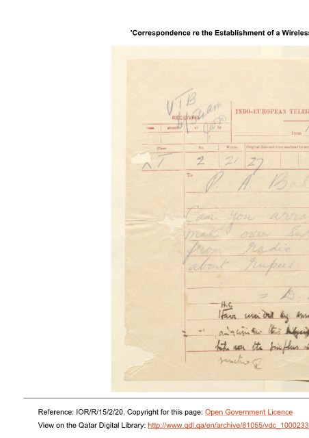 'Correspondence re the Establishment of a Wireless Telegraph Station in Bahrain' [121r] (250/324)