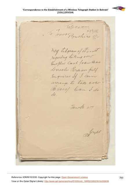'Correspondence re the Establishment of a Wireless Telegraph Station in Bahrain'