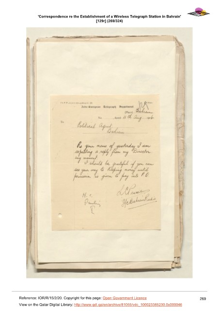 'Correspondence re the Establishment of a Wireless Telegraph Station in Bahrain'
