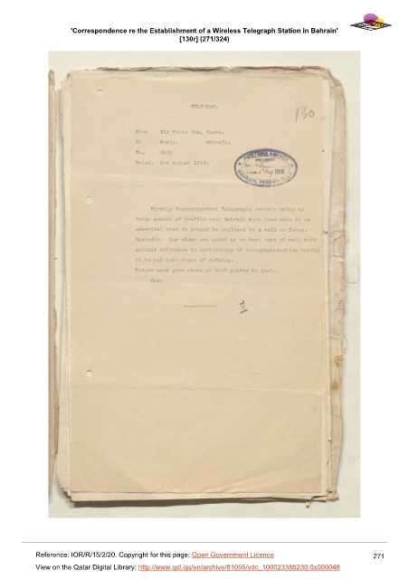 'Correspondence re the Establishment of a Wireless Telegraph Station in Bahrain'